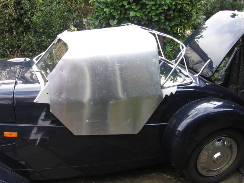 het profiel dat op de voorruit wordt vastgeklemd is van hout en aluminium,